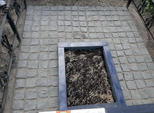 Далее мы приступили к укладке брусчатки: застелили территорию могилы геотекстилем (это поможет предотвратить прорастание сорной травы) и засыпали ткань пескобетонной смесью. Одновременно с этим мы изготовили цветник из полированных гранитных балок и установили его перед надгробьем. На пескобетон выложили ровными рядами брусчатку, а в цветник поместили свежий грунт, который засеяли живым газоном.